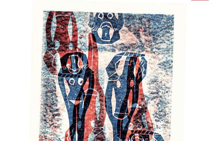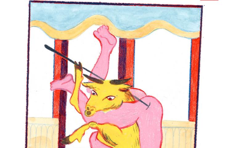 Meanwhile, on the drawing boards in the school's studio, the artefacts were given a new lease of life, springing from the imagination of the students. In their sketchbooks, they explored possible interpretations and developments of their ideas, ultimately arriving at a personal series of images that reimagines the object within a new context or narrative. The third-year students translated some of these images into large-scale screen prints. The second-year students combined a museum piece with a creature from The Book of Imaginary Beings by Jorge Luis Borges in a poster design.