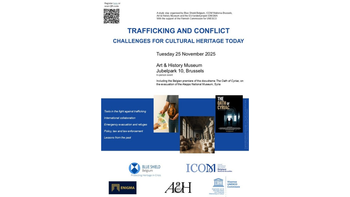 - Morning: Recent developments in the fight against illicit trafficking of cultural heritage, featuring contributions from Belgian law enforcement, ICOM International, European institutions, and research projects addressing looting, theft, and the movement of cultural objects.