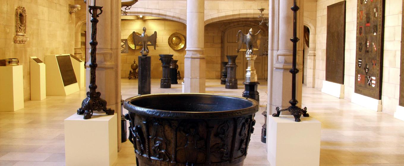 These items are made of cast or hammered copper and its alloys, particularly brass. Another term for them is “Dinanderie,” derived from the town of Dinant on the River Meuse, a centre of high-quality brassware production since the 13th century. Our collection spans the 12th to the 18th century and is exceptional for several reasons, one being the large number of first-class, large-scale objects, including the baptismal font of St. Germanus of Tirlemont (1149), the Paschal-candle stand of St. Ghislain (1442), and the grand Baroque collection plate by Dusart.