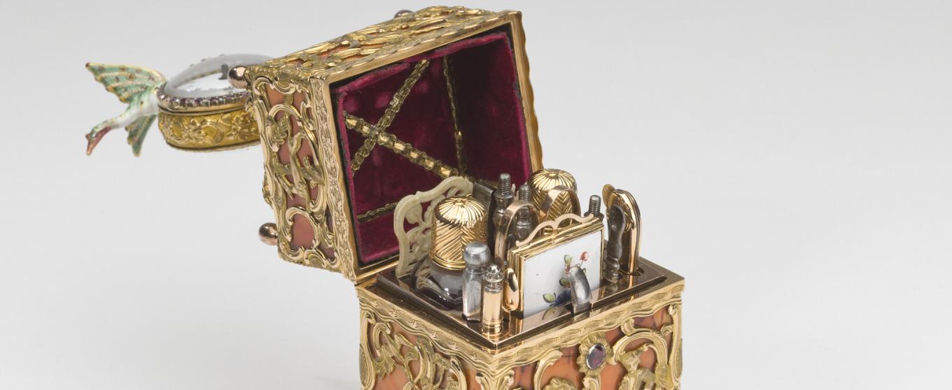Naast kostbare juwelen krijgt u ook eenvoudiger sieraden te zien. Deze laatste hadden vooral een symbolische of emotionele waarde. Ongewoon zijn bijvoorbeeld sieraden gemaakt van haar. Horloges zijn knappe staaltjes van fijne mechaniek en elegante vormgeving. Waaiers brachten verkoeling, verborgen het gelaat of speelden een rol in de niet-verbale communicatie. Balboekjes hielpen de dames herinneren aan de volgorde van hun danspartners. Snuifdozen waren erg in de mode en fungeerden vaak als relatiegeschenk. Toiletsets met flacons en doosjes wijzen op de toenemende zorg voor het lichaam. Brillen...
